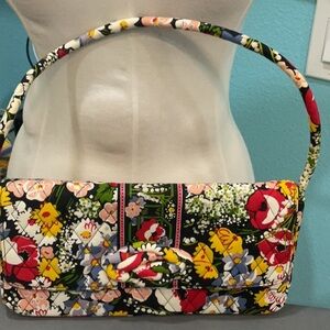 Dark blue quilted oversized tile bag with custom embroidery designs, different on each side, heavy duty zipper, sturdy nylon web strap. Fully lined.