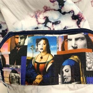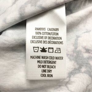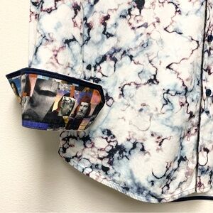 Marble veining pattern in blue and purple on white background. Flip cuffs and contrast collar and button placket feature interesting versions of famous artwork. Long sleeve and collared neckline. 100% cotton.