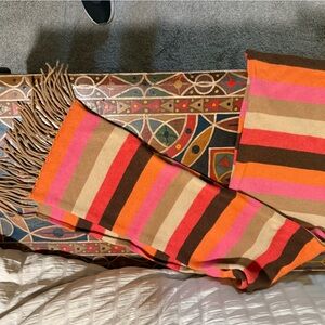 Vibrant scarf with bold stripes. Features fringe detailing. Perfect for adding color to any outfit. The scarf is very long which allows you to wear it many ways. The color combination brightens up the dark winter days. Super soft and cozy cashmere. In excellent condition
