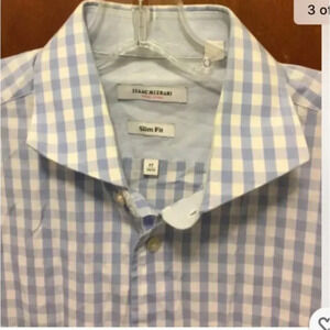Isaac Mizrahi is a blue and white plaid check slim fit shirt. Sz 17 34/35. Euc
