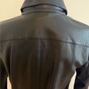 Elevate your style with this sleek Banana Republic black vegan leather button down shirt or jacket. Perfect for any occasion, this jacket offers both comfort and sophistication. New with tag, 18” pit to pit and 26” shoulder to hem.