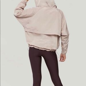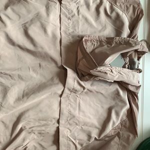 Water repellant hip length jacket from Soia and Kyo. Pretty blush quartz color. Lightweight loose fit. Drawstring hood. Storm vent in back. Sz L/XL