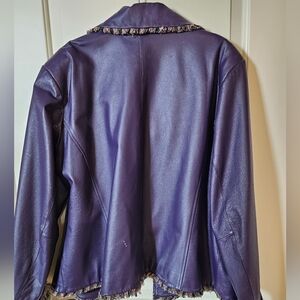 Stylish, comfy purple leather jacket. Unique fringe trim.