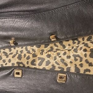 Stylish black leather jacket. Features a bold leopard print lining. Perfect for a chic look. Excellent preloved condition.