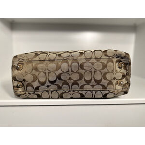 This Y2K vintage Coach bag is a medium-sized shoulder bag with a tan jacquard signature exterior accented with leather details. The bag features a zip closure, a braided leather shoulder strap, and a jacquard and leather lining. It includes inner pockets for organization and a bag charm accessory. This classic and stylish piece is perfect for women who appreciate vintage fashion and quality craftsmanship from a well-known brand like Coach. Very good condition!