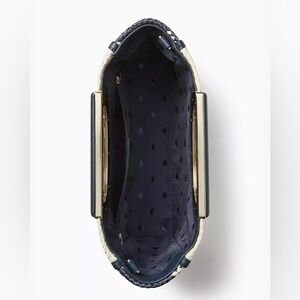 Chic and classic, this beautiful Kate Spade bag features a navy and cream woven gingham checker pattern with smooth leather trim. The structured silhouette and top handle give it a polished, elegant look — perfect for everyday wear, office, brunch, or travel.