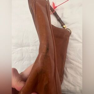 Gucci Diana Large Hobo Shoulder Bag. Brown leather with a bamboo top handle. The front and back look the same. Magnetic clasp on the inside says Gucci on the hardware. Gold toned hardware. There are various spots and marks throughout the leather (please see pictures). There is some rubbing on the corners and a dark mark on the bottom. The lining has been cut out so the interior is just the leather with a light spongy material over it. There is a little chipping on the gold hardware. Purchased and authenticated by @bagriculture and @thebagfather, the famous NY Authenticator.