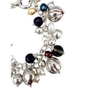 This sophisticated bracelet features a stunning array of multicolored pearls, smoky quartz and amethyst gemstones, meticulously crafted in sterling silver. A versatile addition to any jewelry collection, it's suitable for various occasions, offering both style and elegance. The sturdy extra large spring clasp ensures a secure fit, highlighting its expert Italian craftsmanship. In excellent condition, no damage. Some slight tarnish/patina.