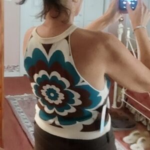 70s vibes, hippie, pair with flare pants!, design on front and back. Sized large but depending on how you want the fit. I'm usually a small for reference