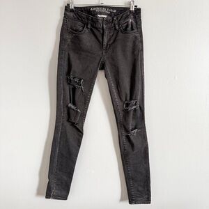 Details: Good gently worn condition, high rise, super skinny fit, distressed tears and holes on the front legs, raw fringe hemline, comfortable material