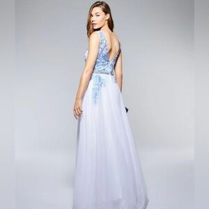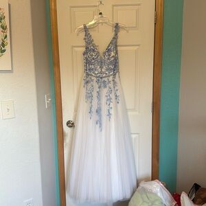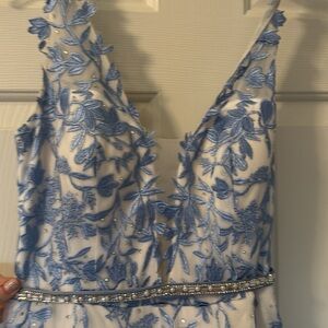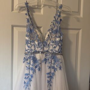 This stunning white sleeveless gown showcases delicate blue floral embroidery and features a chic belt adorned with rhinestones and pearls that cinches the waist to create a flattering silhouette. Whether for prom, weddings, or any special occasion, this dress is sure to turn heads. It’s in excellent condition, never worn—originally purchased for a dance that was unfortunately canceled, so I’d love for someone else to enjoy it! This dress is from the Say Yes to the Dress prom collection, featured on TLC. Although it’s a size 1, I typically wear a size 2, and it fits beautifully. Don’t hesitate to reach out if you have any questions or would like to make an offer!