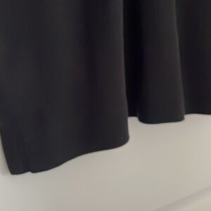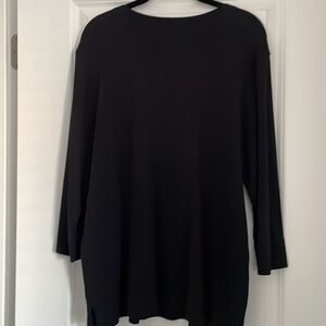 Black Supima cotton knit top has pin tucked button front and 3/4 sleeves. Notches at side hem. Fabric content in photos. Bust measures approximately 46”. Length from center back measures 25”.