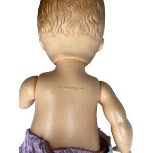 This vintage baby doll from the 1960s, crafted by Horsman Dolls Inc, features captivating blue eyes and a charming pink-lipped smile. There is a hole in the mouth and a hole in the diaper area for drinking/pee'ing style doll.