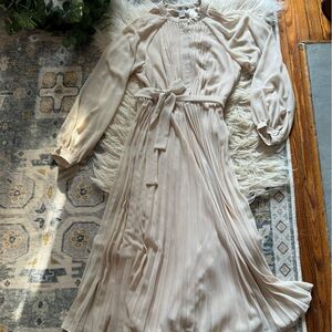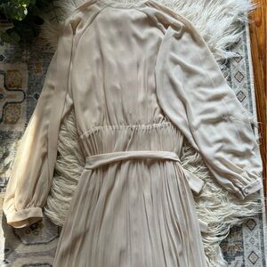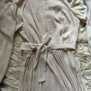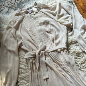 Calf-length dress in pleated chiffon. Round neckline, concealed buttons at top front, and a narrow, elasticized seam at waist with tie belt. Long raglan sleeves and narrow cuffs with covered button. Lined.