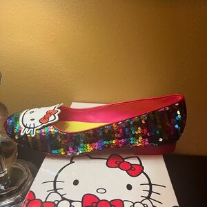 Colorful sequin shoes with Hello Kitty design. Red trim and yellow interior. Perfect for fun outings.
