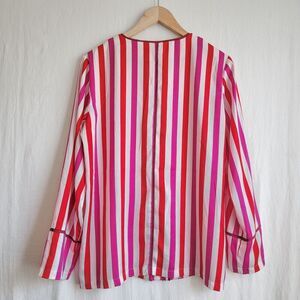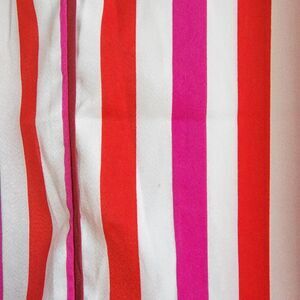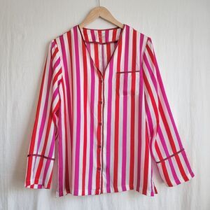 Red, pink, white striped sleep shirt with a satin feel and button front. No stretch. Like new condition