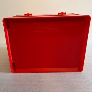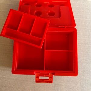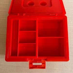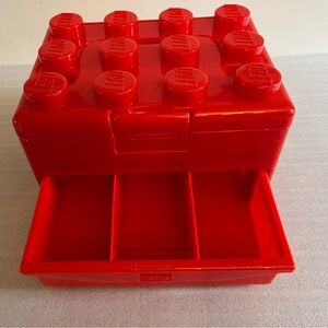2011 LEGO brick storage case. Handle in top. Lid opens for compartments with one removable. Bottom drawer slides out. Measures approx 6 1/2” tall; 9” wide; 7” deep. Obvious signs of use.