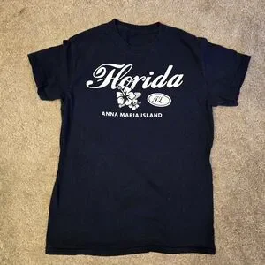 Blue T-shirt with 'Florida' and 'Anna Maria Island' text. Features a floral design.