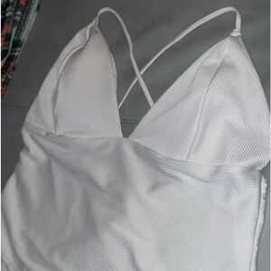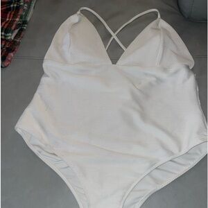 One piece swimsuit. White. Deep v front. Adjustable spaghetti straps that crisscross in back. Open back to below the rib area. Medium booty coverage. Size XL. Fits size 11-13 women with average size breasts. New with tags