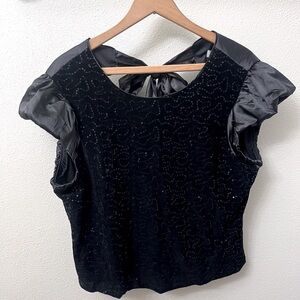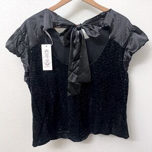 This black blouse features elegant puff sleeves and a stylish tie front design adorned with sequins. The rich black fabric adds a luxurious touch, making it perfect for special occasions. The puff satin sleeve detail enhances its feminine appeal, creating a romantic silhouette. NWT Size large approximately 21 inches from shoulder to hem