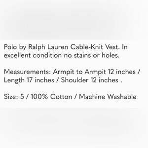 Polo by Ralph Lauren (Size 5) Stylish cable knit design. Sleeveless with V-neck. Iconic logo on chest. In excellent condition no holes, no stains.