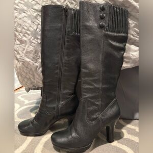 Pre-owned black Sofft leather zip up high-heel boots in women’s size 6.5, in amazing rarely worn condition, with button accents. Built-in stretch around top of boot/calf area for added comfort.