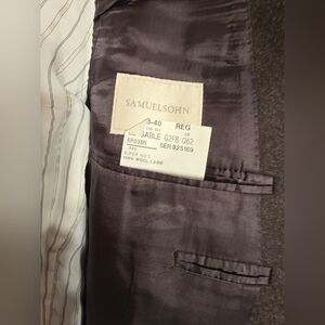 SAMUELSOHN TWO PIECE TWO VENT SHOULDER TO SHOULDER 19" SLEEVE TO SHOULDER 24" ARMPIT TO ARMPIT 24" JACKET LENGTH 31" PANTS WAIST 39" INSEAM WITH CUFFS 29" MADE IN CANADA PRELOVED CONDITION BIN# 2800