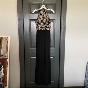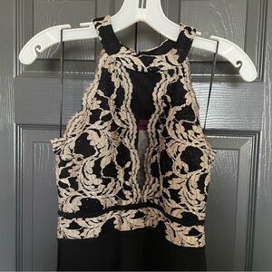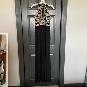 Morgan & Co women’s juniors high neck halter neck black sheath dress with a gold glitter lace bodice in a size 5/6. Skirt is very comfortable and somewhat stretchy. Is padded. Has a sheer deep v neck. Has a slit on the left leg. A little pilling on the skirt but no major signs of wear. Only worn twice, in great condition! Smoke free and dog friendly home!