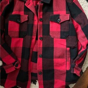 Good used condition. Red and black plaid oversized shirt jacket. Perfect layering piece. Size medium, loose fit. Lucky Brand.