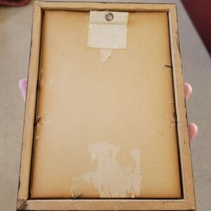 Frame is nailed construction, stained or painted brown and a more modern hanging tab is affixed.
