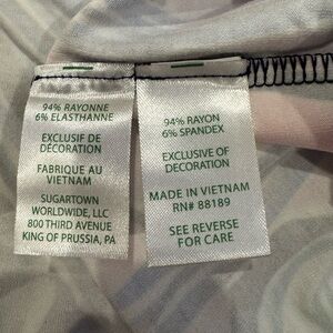 Material is rayon and spandex but feels like a tshirt making this dress very comfortable feeling.