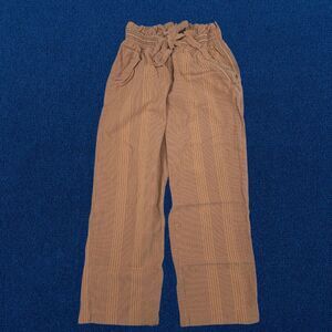 These Senna Sky pants are a stylish choice for women in size XS. They feature a brown striped pattern and a relaxed fit with wide legs. The pants have a high rise and a cropped length, perfect for casual or workwear occasions. Made from breathable cotton knit fabric, they are easy to care for and lightweight. The pull-on style includes pockets and a flat front with a bow accent, adding a touch of bohemian and indie Scandinavian flair. Measures a 22 Waist and has a 22 Inseam.