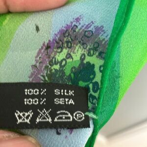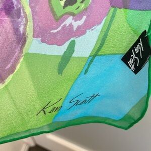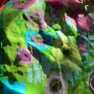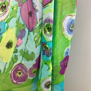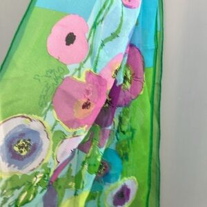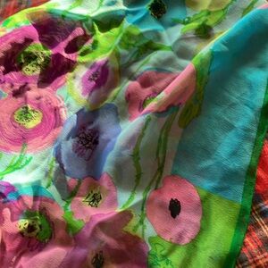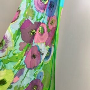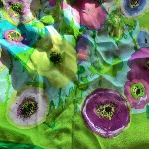 Elevate your style with this vibrant floral art scarf. Featuring a stunning blend of green and purple, this piece adds a touch of elegance to any outfit. All sale finals.