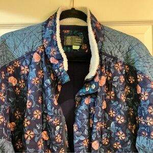 A beautiful, boho, floral patterned jacket. Has two blue patterns. Sherpa lined collar. Pockets.
