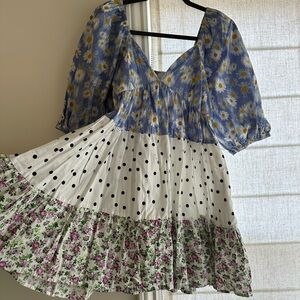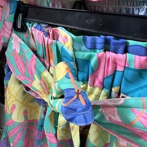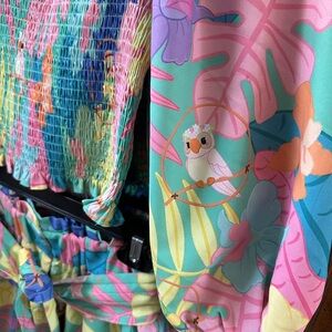 The most adorable Disney's Enchanted Tiki Room inspired two piece set by the small business Park Candy. I don't think they sell this anymore and they only did a limited run. The top is rouched on the bodice and wrists with a puff sleeve that can be worn off the shoulder. The shorts are nice and flowy with an elastic waist and a fun tie. Super comfy overall! Has cute little tiki room nods all over.Worn only once or twice. Size X Small but also fits a Small.