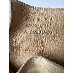 Tan leather knee-high riding boots with closed, rounded toe and full coverage through foot sides, heel, and calf. Features a rugged, distressed finish. Side zipper closure for ease of wear. Lightly cushioned inner sole. Outer sole with 0.5” elevation at toe and 1.5” elevation at heel. EUC. Worn a few times with minor wear on soles.