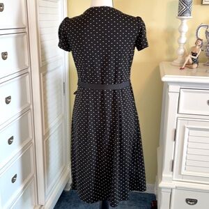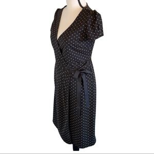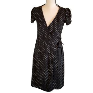 Loft Black Faux Wrap V Neck Dress with Tan Polka Dots & Black Ribbon Side Tie 2P