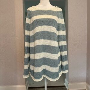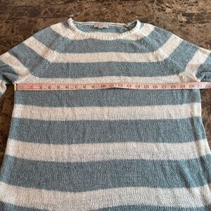 This LOFT sweater features a bold striped design in blue and cream, crafted with a relaxed fit for ultimate comfort. The wide boat-neck neckline and long sleeves enhance its casual appeal, making it a perfect choice for laid-back outings.