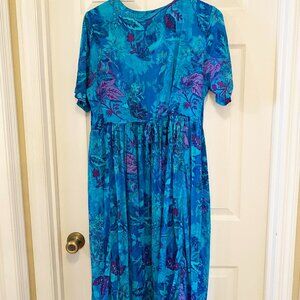 A lovely, comfortable 100% cotton dress by La Cera. Primarily deep aqua blue and purple, with a leafy/floral design. Buttons all the way down the front, ties in the back for a perfect fit. Short sleeves, size XL. Measures 22" from seam to seam on the sides under the arms, and 46" in length down the back from the collar to the hem.