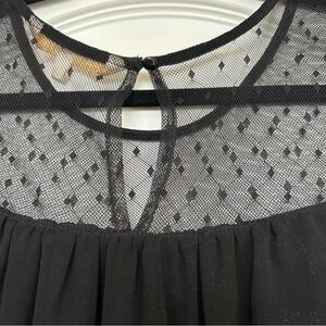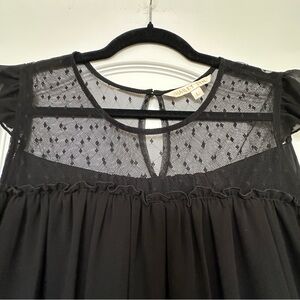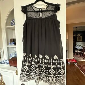 Size L - black, off white flowers, cap ruffle sleeve, slit back button closure.