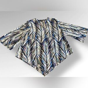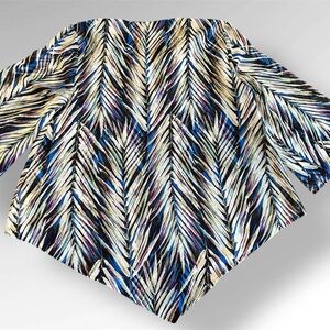 This is a Banana Republic blouse in size M, designed with colorful feathers on a sheer fabric, perfect for a business casual look. The blouse is categorized under women's clothing, specifically tops, and is ideal for adding a pop of color to your outfit. The multicolor design and colorful theme make this blouse a unique and stylish choice for various occasions, from work meetings to casual outings.