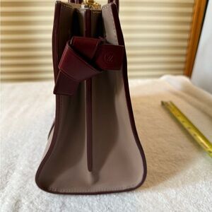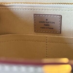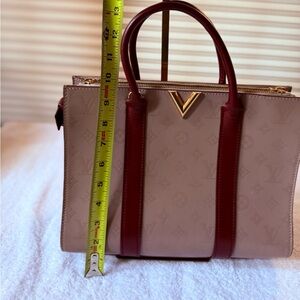 This is an authentic LOUIS VUITTON Monogram Cuir Plume Very Tote MM in Mastic and Raisin. Very good condition. Clean exterior. No signs of wear. One very small mark inside. This shoulder bag is crafted of soft calf leather with an embossed Louis Vuitton monogram. The handbag features rolled leather top handles, leather cinching along the sides and polished brass hardware including a prominent "V" on the front. The top is open to a compartmentalized suede leather interior with patch pockets and a central zippered section.