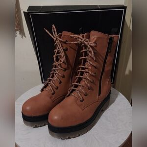 Stylish tan and black lace-up combat boots. Features side zipper design. Durable and trendy design. Never worn, though there are a few scuffs on the outside, see pictures. Size 7