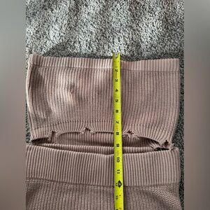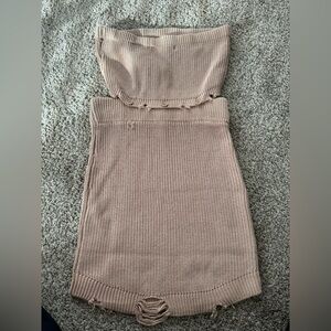 Sleeveless/Strapless, Cut Out but top attaches to bottom via buttons as pictured (comes with extra button), very good quality, thick knit sweater like material, top is tube top style, mini, short, distressed
