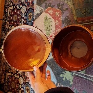 Fantastic vintage Henri round leather "spaceship" handbag. Features a sturdy leather handle with goldstone mounts, gold clasp, white stitching detail on all the leather & 3 lunar landing gold feet. Single inner compartment. Amazing, the most unusual vintage bag I've ever seen, definitely one-of-a-kind!!! Excellent vintage condition.