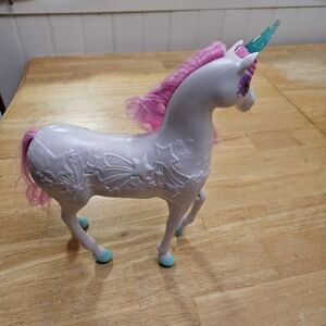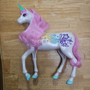 Barbie Dreamtopia Unicorn Interactive Toy with Lights and Sound. White unicorn with pink mane and tail. Stars light up, and unicorn plays music when you push the button. Ages 3+. Unicorn only, brush not included.