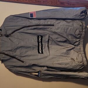"Blast off in the Space Suit silver reflective pullover jacket from Members Only. This unique jacket features silver reflective polyester construction for a look that will draw attention, even in the dark. Two diagonal collar zips add an out-of-this-world look, while two hand pockets and a zip anorak pocket adds plenty of storage space. An adjustable hood with elastic drawcords, along with elastic sleeve cuffs and bottom hem provide a comfortable fit, and two decorative badges at the shoulders add even more space-inspired flair."