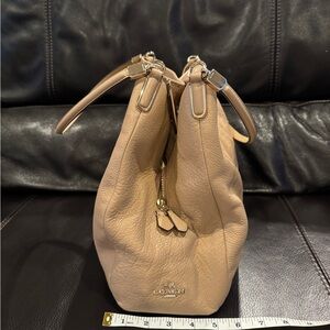 Excellent condition gently used Coach women’s handbag in a beautiful tan color. Leather extremely soft. Two large compartments. One small inner zipper compartment. One small zipper pouch and two small open pockets. No scratches no tears.
