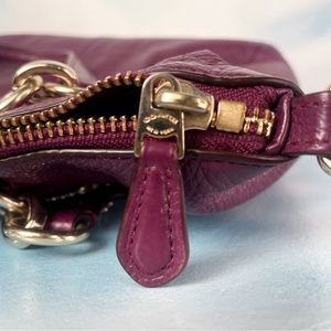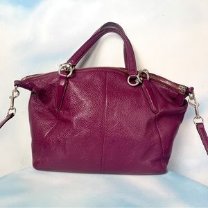 Beautiful “Kelsey” pebbled leather bag from Coach. Burgundy but on the purple side, especially in warm light; maybe it’s plum? Comes with Coach dust bag. EUC