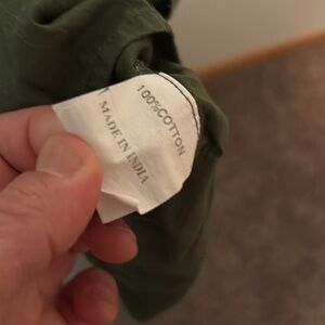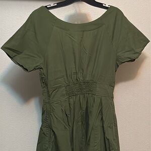 Has banded waist in front, smocked waist in the back, scoop neck, non stretchy fabric. 100% cotton. Color is army green. Unlined. Short sleeves. Has pockets. Side zip. Small repair to top of zipper. Shown in pics. Size 10. bust 16.5 inches length 38 inches hip 23 inches waist 14 inches. Smoke free pet friendly home. Gently worn, no rips, fading, or stains.